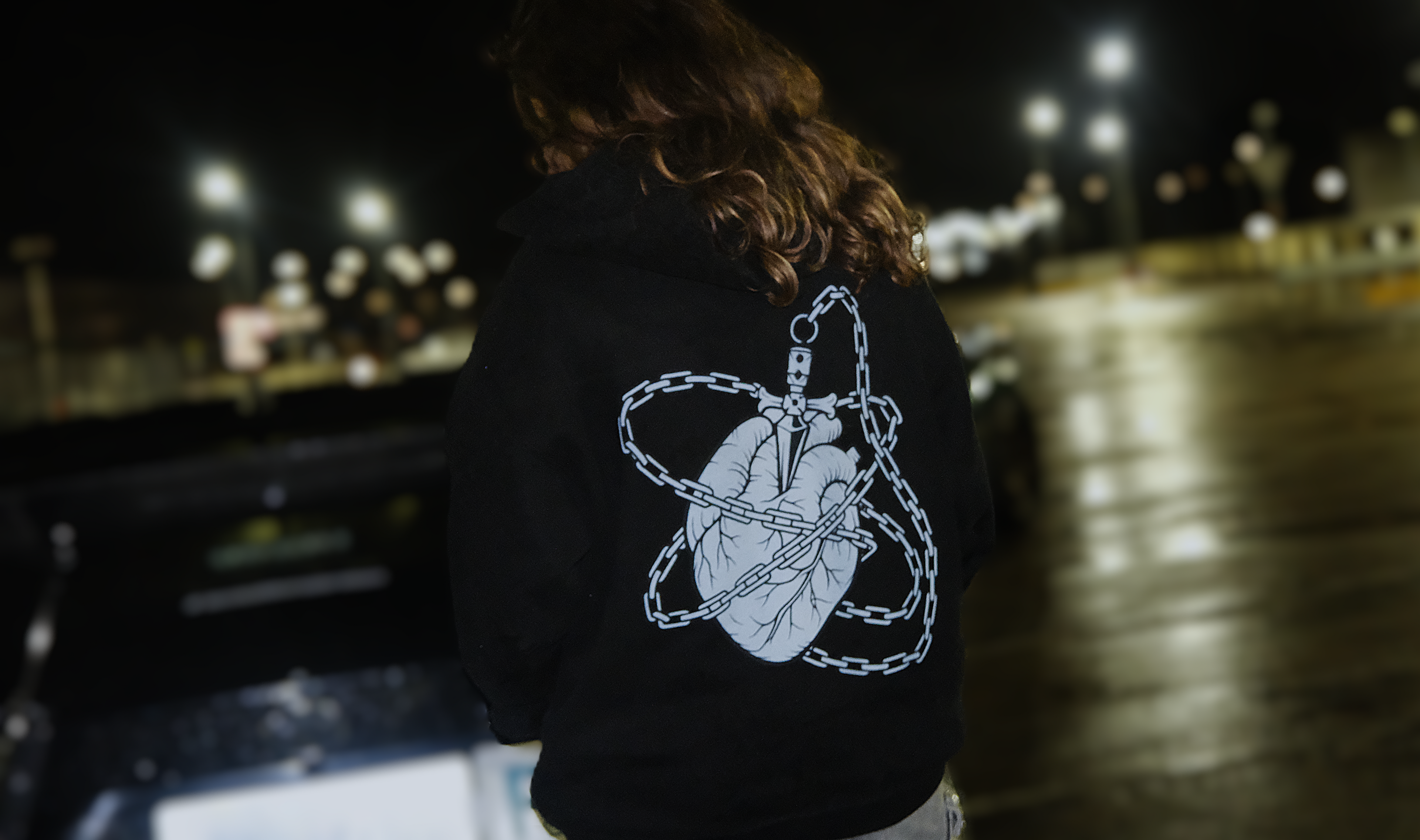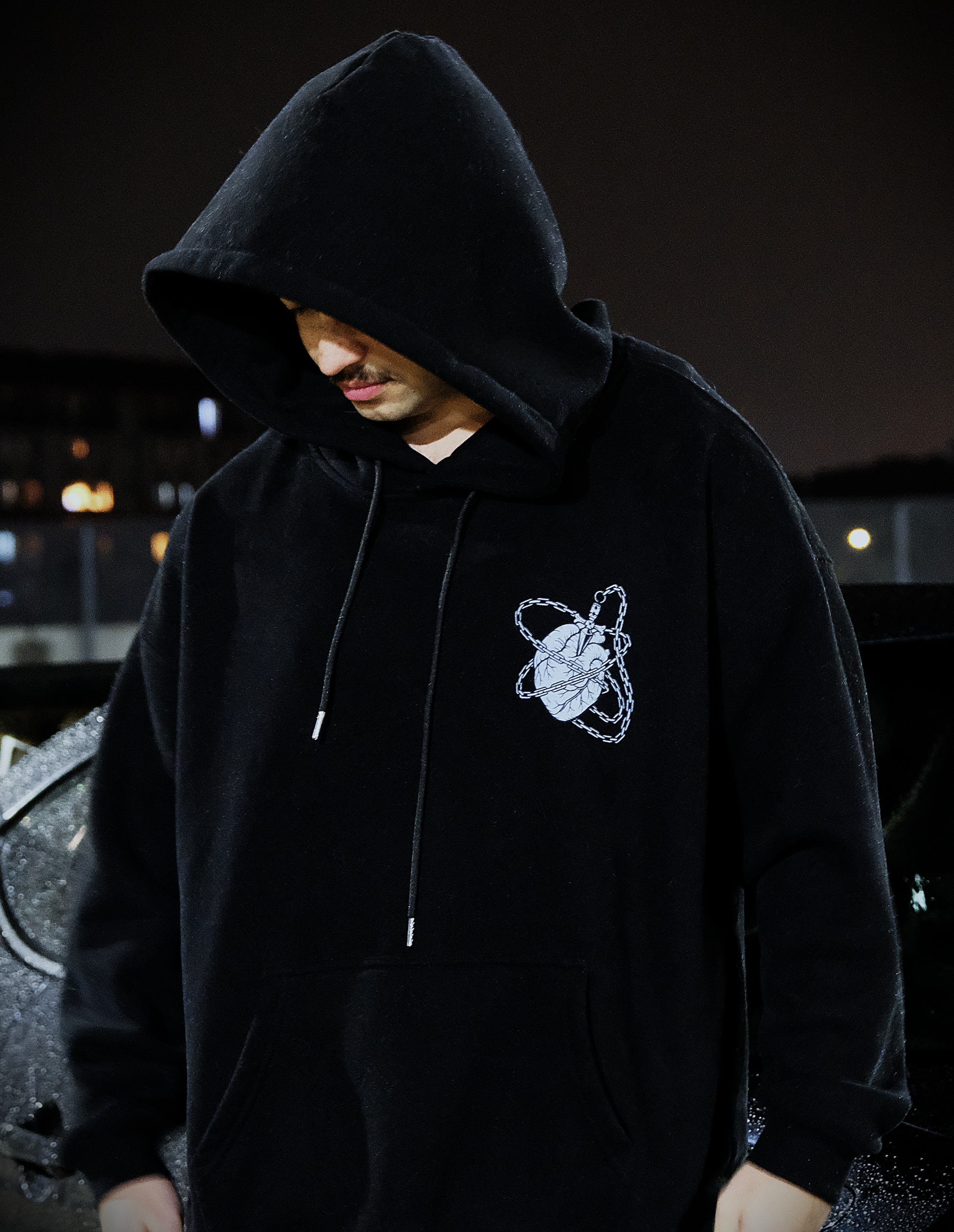 HEARTBOUND Hoodie in jet black is crafted from luxury quality thick cotton, with an oversized fit, drawstrings, drop shoulders, and deep overarched hood. The hoodie features a peel-proof pattern on both sides. The hoodie has ribbed hems and cuffs.